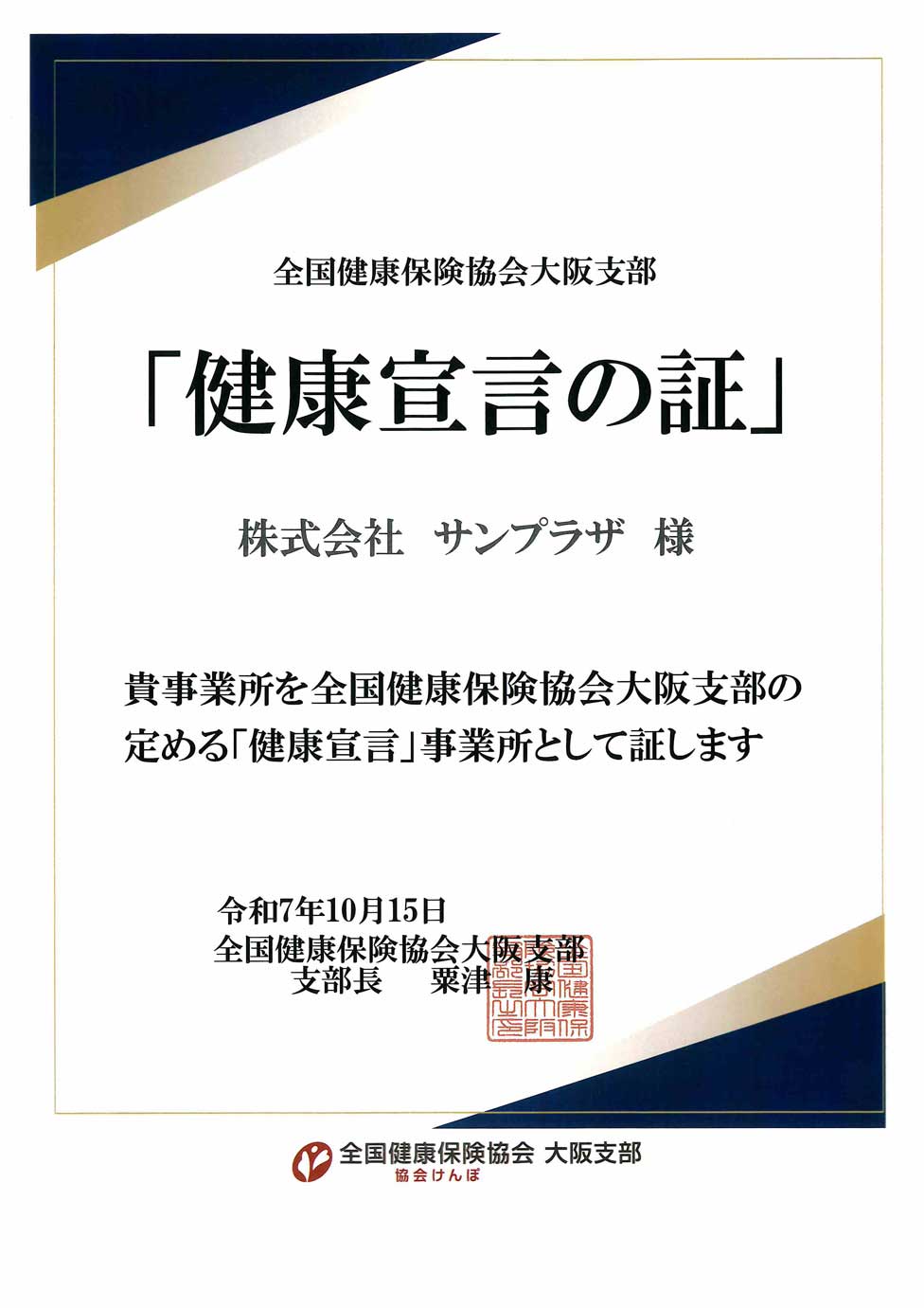 サンプラザは全国健康保険協会大阪支部の定める「健康宣言」事業者に登録し、職場の健康づくりを推進しています。